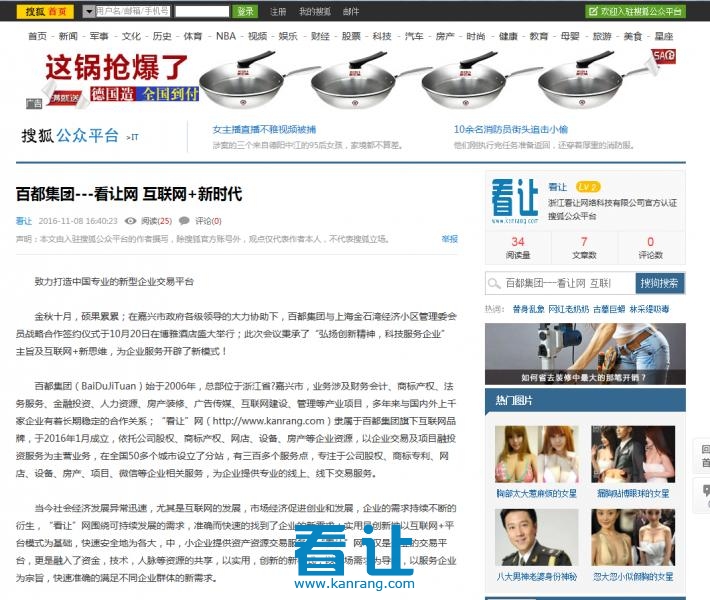 百都集团(BaiDuJiTuan)始于2006年,总部位于浙江省?嘉兴市,业务涉及财务会计、商标产权、法务服务、金融投资、人力资源、房产装修、广告传媒、互联网建设、管理等产业项目,多年来与国内外上千家企业有着长期稳定的合作关系;“看让”网(http://fengrunx.kanrang.com)隶属于百都集团旗下互联网品牌,于2016年1月成立,依托公司股权、商标产权、网店、设备、房产等企业资源,以企业交易及项目融投资服务为主营业务,在全国50多个城市设立了分站,有三百多个服务点,专注于公司股权、商标专利、网店、设备、房产、项目、微信等企业相关服务,为企业提供专业的线上、线下交易服务。